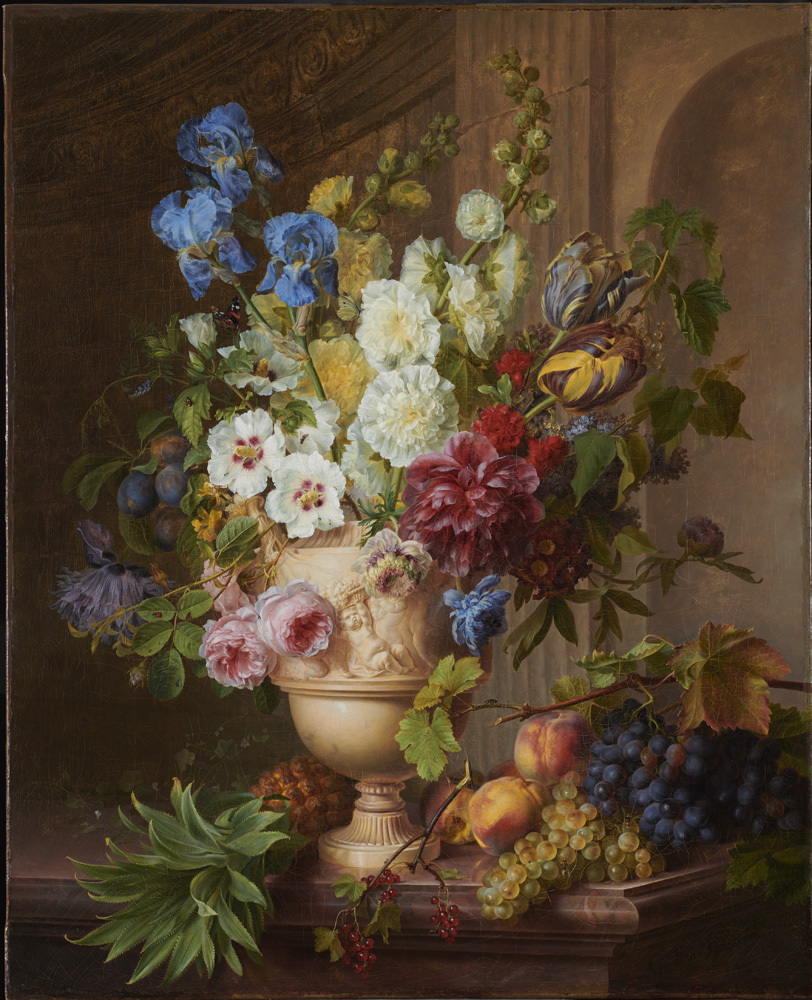 - TitelBloemen in een albasten vaas en vruchten op een marmeren blad