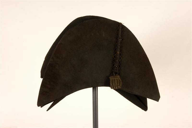 Steek van zwart vilt. Opgeslagen voor- en achterrand vlak. Op voorkant, links van het midden, een vertikale versiering. De versiering bestaat uit een met zwarte zijde geborduurde 5-puntige ster, waarboven een steeds smaller wordende band van zwart borduurwerk. Op deze band een zigzagmotief en 3 zwarte bloemetjes. Om het geheel, in punten opgenaaid, een van zwart garen gehaakt koord. Zweetband van bruin leer. Voering van de bol: zwarte zijde. Langs de gleuf van de bol aan de voorkant 4 en aan de achterkant 2 metalen ogen, corresponderen met 4 resp. 2 metalen ogen op de binnenkant van de randen. Door een van de ogen een restje zwart zijden riblint, met knoopje in het lint. Steek door Cornelis Antonie Roomer gedragen toen hij Napoleon I als garde d'honneur op zijn reis van Heusden naar Nijmegen vergezelde. Cornelis Antonie Roomer, geboren te Heusden op 13-6-1779 en overleden te Heusden op 23-6-1839.