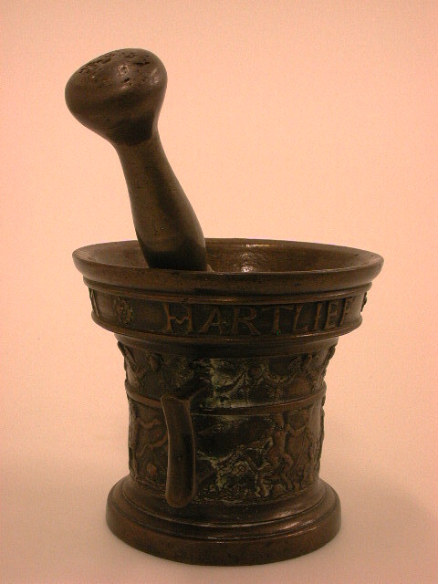 - BeschrijvingGeprofileerde voet. Brede rand. Rechthoekige oren. Op de rand in kapitalen: WILLEM*HARTLIEF*1576. Rondom vijzellichaam reliƫffries met dansende satyrs in landschap. Daarboven smaller fries met guirlandes tussen afwisselend maskers en cherubijnenkopjes. Stamper met geringde middennodus.