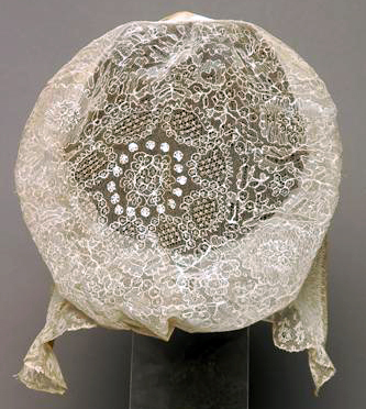 Muts met fijn geplooide voorstrook, 10.5-12.5 cm. breed, bestaande uit 2 delen: een strook kant 8 cm. breed en een strook gaas 7.5-9 cm. breed. De kant en het gaas overlappen elkaar over een breedte van 4.5 cm. De kant van de voorstrook loopt op halve breedte door langs de zijkanten van deze strook en is daar gerimpeld aangezet. Voorstrook aan beide zijden verstevigd met sutiën. Tulen schildje, 1.5 cm breed. Bodem van doorgestopte tule met eenbloemig patroon. Aan de onderzijde van de bodem in lussen genaaid katoenen garen, waardoor twee katoenen bandjes geschoven zijn. Kroezel of kroon. Op een brede strook gesteven gaas zijn takjes bloemen genaaid. Takjes met geel/cremekleurig papier omwonden ijzerdraad. Bloemetjes van witte gesteven katoen. Meeldraadje wit, knopjes geel. Tussen de bloemetjes glazen bolletjes op steeltjes (dauwdruppeltjes) en witte katoenen tule. Langs beide zijden van de strook katoen zijn smalle kantjes genaaid. Aan de korte zijden zijn cremekleurige zijden linten met ingeweven bloemmotief gezet. Linten afgezet met een kantje. In het midden van de linten een plooi. Sluiting met haakje en oogje. Kroon in 1986 aangetroffen met inv.nr. 8741. Mogelijk is dit niet het juiste nummer! In 1937-1938 opnieuw ingeschreven onder nr. 8741. Het oorspronkelijke inv.nr. was 7723. In de aantekeningen op het briefje achter inv.nr. 8678 in het inv.boek worden 2 strikken uit Princenhage, 1 kroon uit de Baronie van Breda en 1 kroon uit Made (samen met een muts) vermeld. In 1937-19938 wordt onder de inv.nrs. 8740 en 8741 telkens een muts met kroon beschreven en onder de inv.nrs. 8742 en 8748 een muts met strik. Mogelijk zijn in 1937-1938 deze mutsen, kronen en strikken met elkaar verwisseld. Zie ook inv.nr. NN 246