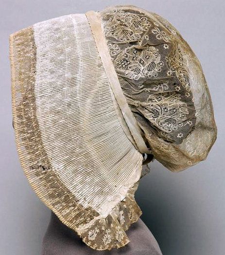 Muts met fijn geplooide voorstrook, 10-13.5 cm. breed, bestaande uit 2 delen: een strook kant van 8 cm. breed en een strook gaas van 7-9.5 cm. breed. De kant en het gaas overlappen elkaar over een breedte van 5 cm. Aan beide zijden van de geplooide strook is een reepje kant (op halve breedte) gerimpeld vastgezet. De voorstrook is aan beide zijden verstevigd met sutiën. Tulen schildje 1 cm breed. Bodem van doorgestopte tule. Het patroon bestaat uit losse rozetten van bloemen met daartussen een strooimotiefje. Aan de onderzijde van de bodem in lussen genaaid katoen garen, waardoor twee katoenen bandjes geschoven zijn. Cremekleurige zijden strik, satijn met bloemmotief. Vanuit de knoop in het midden naar beide zijden twee lussen en een lint. De linten zijn aan de uiteinden geplooid en worden onder de muts met elkaar verbonden door middel van een haak en een oog.