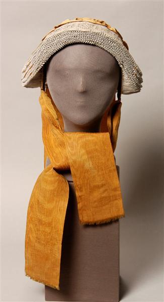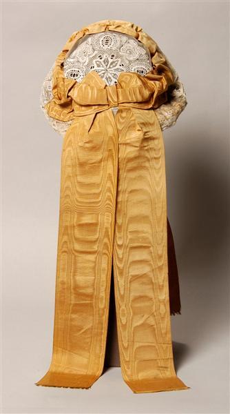 8 geplooide voorstroken: 7 van tule met smal kantje (1 cm.breed), de 2e strook van boven van witte katoen met eenzelfde kantje. Boven de voorstroken 2 stroken machinale kant (elk 3 cm. breed), dakpansgewijs over elkaar geplaatst. Voorstroken en de daarover liggende kant zijn samen boven de oren iets naar achter en naar buiten gebogen. In de ronding telkens na 2 stroken een reepje goudgeel moire zijden lint. De voorstroken zijn genaaid op een ± 3 cm brede katoenen strook. Tussen deze strook en de bodem een gesteven reep katoen van ± 4.5 cm breed. Bodem van zwarte (opengeweven) gesteven katoen. Over de zwarte katoen witte tule, versierd met plumetis borduurwerk in eenbloemig patroon. Rondom de bodem is een goudgeel moirezijden lint (9 cm breed) gerimpeld vastgezet. Het eindigt aan de onderzijde onder een strik met afhangende linten (als boven beschreven). Aan de achterzijde, iets boven de onderkant van de bodem, twee stroken kant (glad en dakpansgewijs aangezet) waartussen een smalle strook van bovengenoemd lint is genaaid. Stroken kant aan de binnenzijde verstevigd met laiton. Langs de onderrand van de bodem 2 doorgeschoven katoenen bandjes. Kinstrikken van goudgeel moirezijden lint. Wordt mogelijk ook strikkenmuts genoemd. In 1937-1938 opnieuw ingeschreven onder inv.nr. 8746. Het oorspronkelijke nummer was 7723