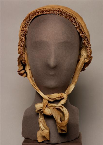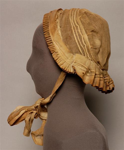 Mutsje uit Willemstad, geheel vervaardigd van neteldoek. 2 boven elkaar geplaatste geplooide voorstroken. Daaroverheen een band met 2 gerolde randen, aan beide zijden gedraaid, opgenaaid. Schildje met 3 opnaadjes. Onversierde bodem. Luifke grof geplooid met 2 opnaadjes en aan de binnenzijde verstevigd met donkerbruine sutiën. 2 striklinten. De rand van het mutsje is verstevigd met gevlochten stro.