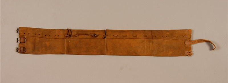 - BeschrijvingBruine leren gordel waarmee de Noordbrabantse kooplieden in het midden van de 19e eeuw ter markt gingen. De band is dubbelgeslagen en voorzien van 2 aangeknipte kleppen langs de bovenzijde. In de band zijn 4 vakken gestikt. De kleppen worden gesloten met een bruine leren veter. De gordel wordt gesloten met 3 leren riempjes en 3 metalen gespen. In de vakken borg men het geld.