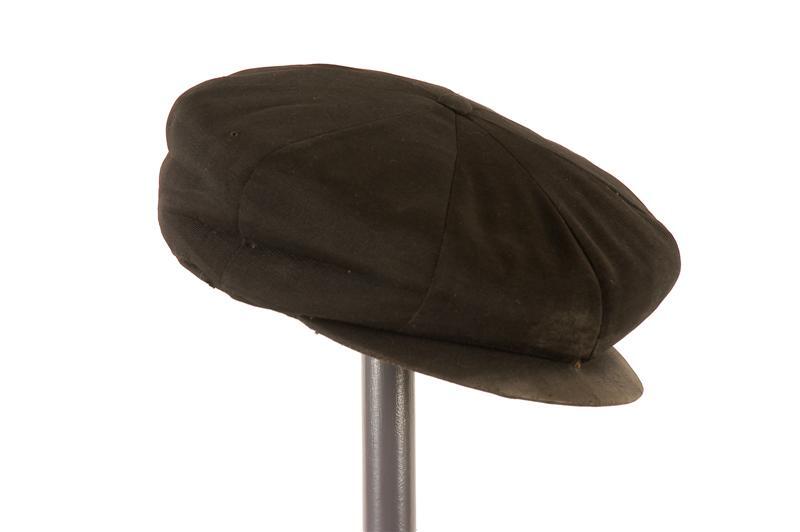 - BeschrijvingPet van zwart zijde ribweefsel. Bol bestaat uit 8 cirkelsegmenten. Op het middelpunt een stofknoopje. Klep bekleed met dezelfde stof. In het midden een splitpen. Zweetbandje van zwarte katoenen satijn. Opstaande rand gevoerd met katoenen keper, bodem met zwart katoenen satijn. Satijn 5 maal doorgestikt met geel garen.
