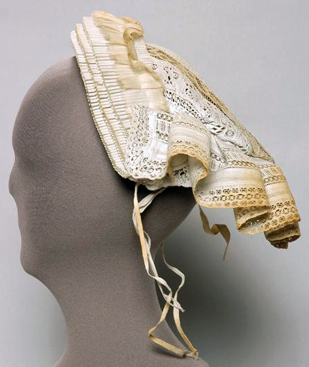 3 dakpansgewijze over elkaar liggende geplooide voorstroken. Onder de stroken een reep neteldoek, verstevigd met sutiƫn. Over de stroken een plat geplooid reepje neteldoek. De bodem bestaat uit aan elkaar genaaide stroken entre-deux en stroken machinale kant. In de hoek tussen voorstrook, bodem en onderrand van de muts een ingezet stukje van kant en entre-deux. Luifke van randen machinale kant en effen neteldoek. Onder aan de bodem 2 doorgeschoven bandjes. Striklintjes van veterband.