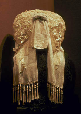 Crèmekleurige poffer. Romp van witte katoen, verstevigd met fijn gaas en dik laiton. Oren van stijf gaas. Onder op de romp een elastiekje, middenachter een uitstekend gazen lapje, middenvoor een metalen haakje. Voorstrook in 2 lagen boven elkaar. Iedere laag wordt gevormd door een in stolpplooien gelegd strookje gesteven kant. Achterstrookje van gesteven kant in dubbele stolpplooien gevouwen. Strikken van rayon met 2 elkaar kruisende ingeweven bloemenslingers. Open randje langs beide zijden. Rayon flossen. Strikken bovenaan bevestigd aan strookjes grof gaas. Machinaal kant (type doorgestopte tule) zigzagsgewijze over de strikken gelegd. Versiering op de romp en de strikken, katoenen bloemen en blaadjes, rayonbloemen, wasbloempjes, diverse soorten chenilledraad, satijnen blaadjes, kant, tule, beklede glazen bolletjes, rozenknopjes, enz. Bloemen en blaadjes gedeeltelijk groen en rose gekleurd. Over het geheel van bloemen een tulen netje. Op de oude kaart wordt vermeld: 'uit de Meierij van handgewerkte kant, oud model, met rijke en kleurig gebloemde poffer van rose rozenknoppen en witte oranjebloesem, zondagse dracht'.