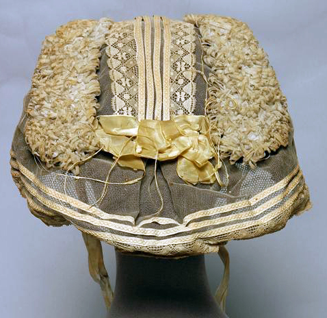 3 dakpansgewijze over elkaar liggende geplooide voorstroken van neteldoek. Over de voorstroken een ecru zijden riblint, in het midden gedraaid, aan beide zijden met lussen. Bodem en onderrand van witte katoene tule. Bodem versierd met 4 smalle fantasiebandjes tussen machinale kant. Op beide zijden van de bodem rugjes van in lussen gelegd en ingeknipt neteldoek (veertjes). Tussen de onderzijde van de rugjes een strik van ecru zijde met afhangende linten. Op de onderzijde van de tulen onderrand 3 fantasiebandjes en een machinaal kantje (bandjes en kant als op bodem). Het geheel is gemonteerd op stijf zwart gaas en is verstevigd met ijzerdraad en sutien. Striklinten van neteldoek eindigend in een strookje broderie.