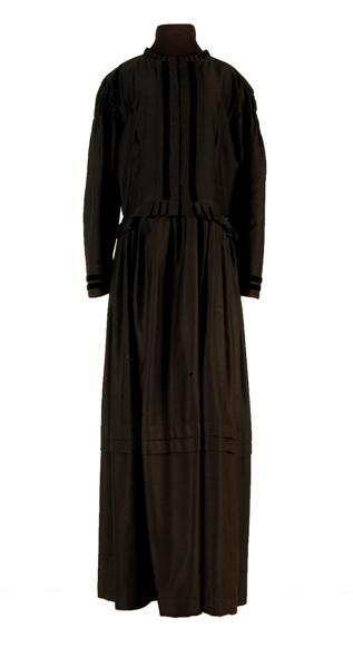 Zwarte merinos japon. Overgangstype tussen japon en lijf en rok. Het lijfje sluit middenvoor met 10 metalen haken en ogen. Evenwijzig aan de sluiting, aan beide zijden, een plooi versierd met een zwart fluwelen bandje. Langs de hals een geplooid ruche, aan de taille een zeer kort aangeplooid schootje (4 cm lang). Kop van de mouwen met meer draden onder elkaar gerimpeld. Aan de onderrand van de mouwen een splitje en 2 opgenaaide fluwelen bandjes. De splitjes worden gesloten met 2 metalen haakjes en 2 trensjes. Rok aangerimpeld aan de taillenaad van het lijf. Split aan de rechterzijde. Rokdeel tussen split en sluiting van het lijf aan de taillenaad bevestigd met 2 haakjes en 2 trensjes. 2 opnaden in de rok. Middenachter in het rugpand een vertikaal ingestikt plooitje. Aan de binnenzijde in de taille een ophanglus. 4-11-1986 in Vught ongenummerd aangetroffen.