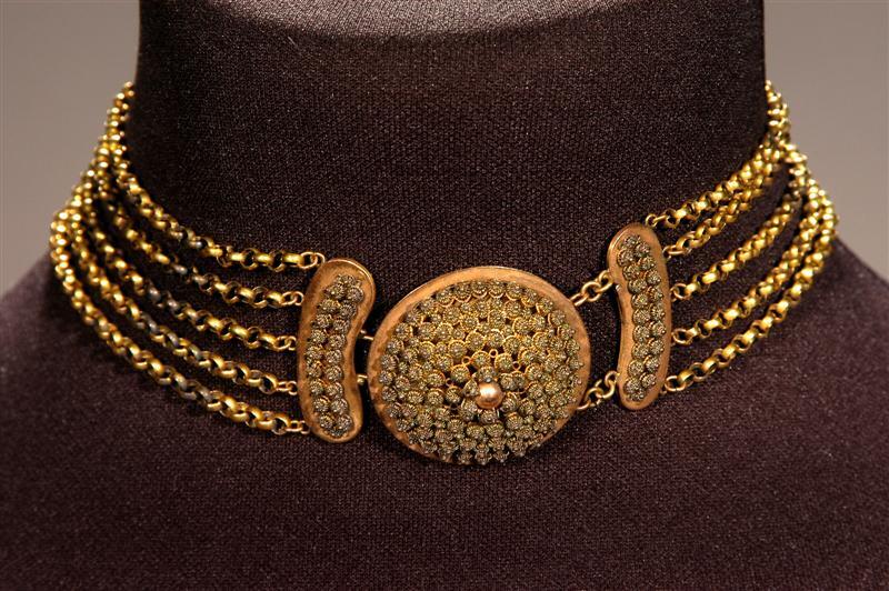 - BeschrijvingBestaande uit 5 rijen jasseron schakels met slot. Slot met cantiergoud. Gelijk van vorm aan slot van inv.nr. 8796 en broche inv.nr. 8791. Filigrainwerk (knopjes) aan de bovenkant. In het midden een glad, half bolletje.