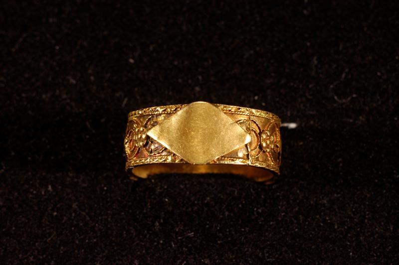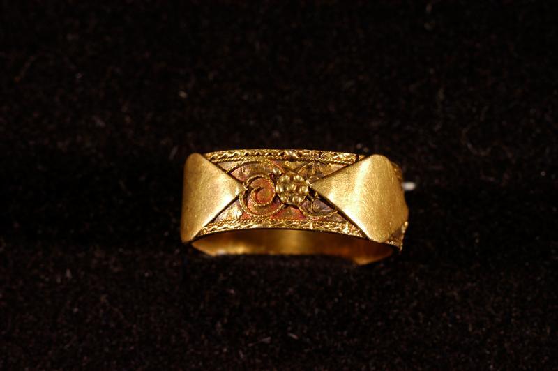 - BeschrijvingGouden ring met filigrain-versiering tegen een gesloten achtergrond en 3 ruitvormige blanke schildjes (poliplaatjes). Langs de rand een versiering van gevlochten draad.