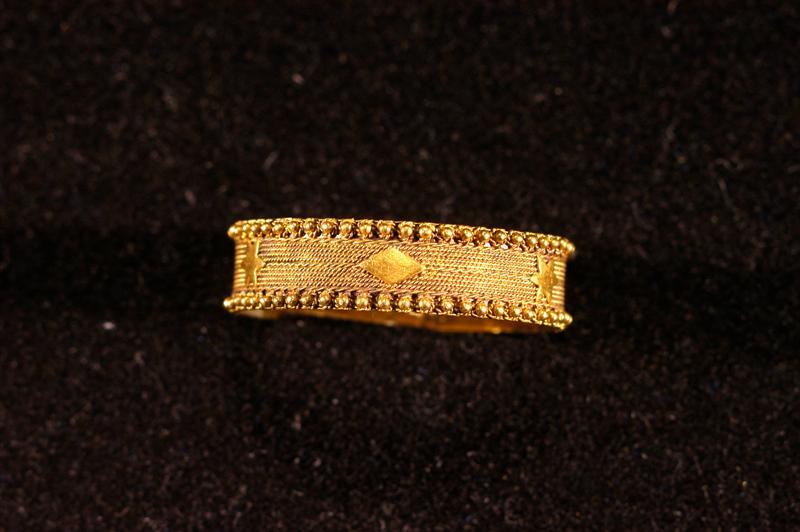 - BeschrijvingMet twee parelranden en op de middenband afwisselend een ster en een ruit en reliƫf. Randen bestaan uit hele fijne spinnetjes van cantille en bolletjes. Het oppervlak is gegreind, met gladde versierinkjes in ster- en ruitvorm.