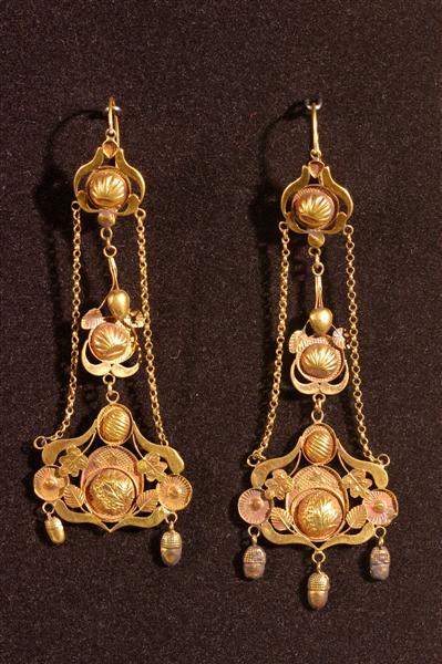 Boerinnen-oorbellen. Driedelig, met 2 jasseronkettinkjes verbonden. Hol gestampt en gestanst.