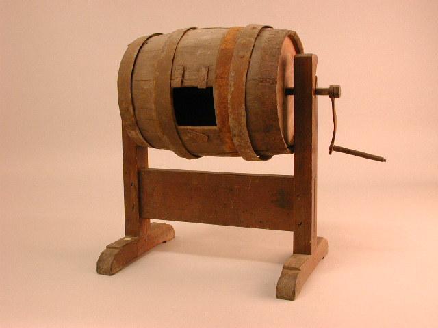 - BeschrijvingHouten ton met twee binnenschotten, 4 ijzeren duigen en vierkante, door (verdwenen) klep afgesloten opening. Door de ton een ijzeren as, waaraan dito slinger. As hangend in houten standaard.