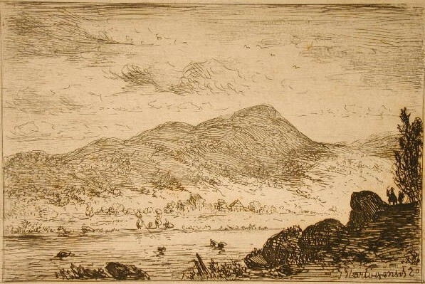 - BeschrijvingGezicht op een rivier. Aan de oever ligt een dorpje en aan het water bevinden zich enkele mensen. Rechts op een heuveltje rijden twee ruiters. Op de achtergrond een gebergte.