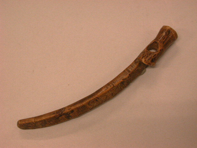 - BeschrijvingGebogen houten breischei. Bovenste gedeelte rond. Bovenin een niet doorgeboord gat. Daaronder, horizontaal, een groot (wel doorgeboord) gat. Het lange, gebogen onderste gedeelte heeft een halfronde doorsnede (een helft van het stokje is weggesneden).