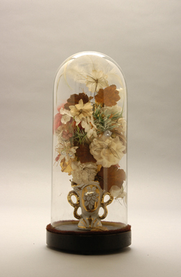 - BeschrijvingRond houten voetstuk. Glazen stolp. Rood chenille koord rond voetrand. Wit porseleinen vaasje, kelkvormig uitlopend, met dubbele staande oren en bloemdecoratie, goud op wit geschilderd ("Vieux Bruxelles"). Kunstbloemen en takken in wit, rood, bruin en groen.