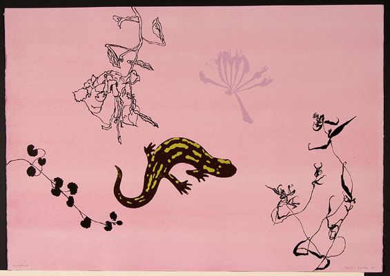 - BeschrijvingOp roze ondergrond zeefdrukken van salamander, witte kamperfoelie, hondsdraf, reuzenbalsemien en hengel.