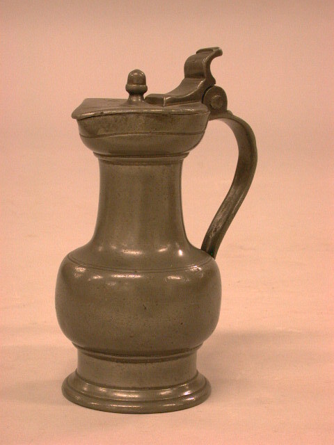 Keuls kannetje met geprofileerde standring, rechte aanzet van de buik flauw gebolde buik, ingesnoerd tot een hals aan de bovenzijde en dan verwijd tot kraag die aan de voorkant tot een schenktuit is uitgebogen. Deksel volgt vorm van deze kraag en is met het tweekakig scharnier vastgezet op de handgreep. Midden op de deksel bevindt zich een eikelvormig knopje, ter weerszijden daarvan zijn de initialen A E in de deksel geslagen. Tegen de binnenzijde van de deksel in witte verf het inv.nr. 27. Deksel, buik, kraag en voet van het kannetje zijn versierd met enkele ingegraveerde lijnen en profielen