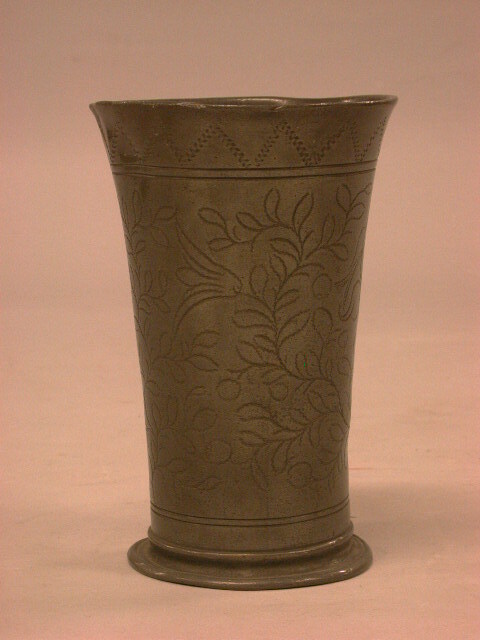 - BeschrijvingMet gravering van een granaatappel, waarop twee vogeltjes, omgeven door bloemenranken, aan tulpen. Langs bovenrand afgesloten door een dubbele gedraaide groef en een gegraveerde zig-zag lijn. Mogelijk een "bruidsbeker".