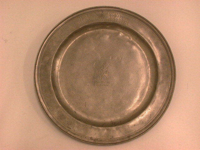 Hollandse, grote schotel met geprofileerde rand. Afkomstig van een St. Barbaragilde, blijkens de gravering van deze heilige midden op de schotel met 'S.BARBARA'. Midden boven in de rand de volgende gegraveerde initialen en jaartal ter weerszijden van twee gekruiste geweren in een vuurslag: HVE, IVHB, HVDD en HAN, IVE, WAS, 1735.