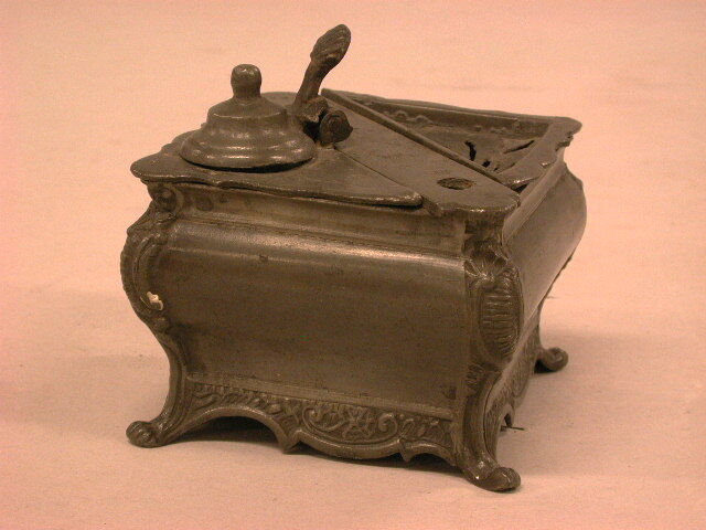 - BeschrijvingVierkant raadsheertje in Hollandse Regence-stijl, met laatje, zandstrooier, inktpotje en plaats voor twee veren.