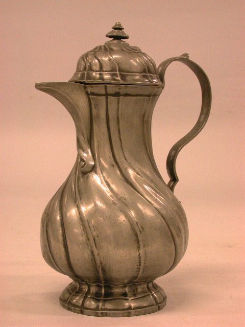 - BeschrijvingDuits, getorst model in Lodewijk XV-stijl, ook deksel en schenktuit zijn getorst, de handgreep niet. De deksel is met een dubbelkakig scharnier dwars op de hals van de kan bevestigd.