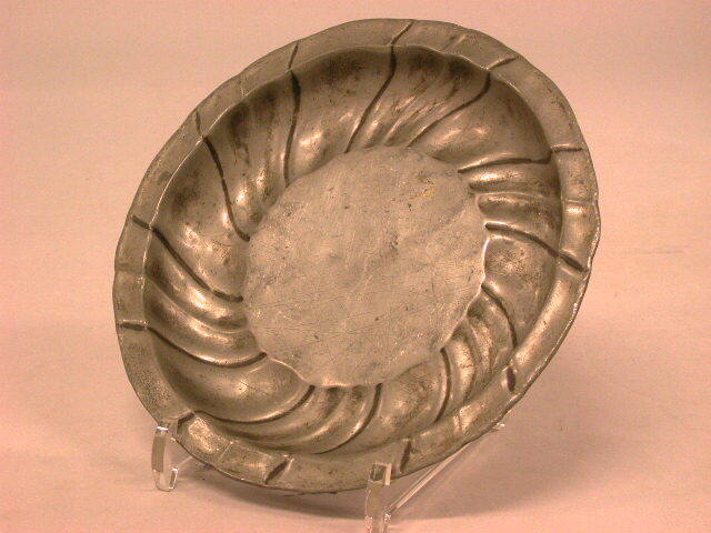 Duits. Diep bord of schaaltje met iets verheven vlak middendeel en daaromheen een getorste/geschulpte rand.
