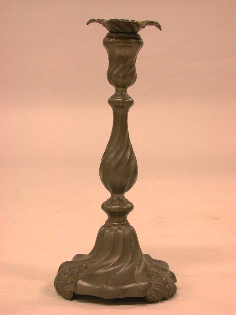 Hollandse kandelaar, in Lodewijk XV-stijl. Voet, stam met baluster en nodus naar rechts getorst.De losse tulpvormige kaarsenhouder in de bobĂȘche (vetvanger) naar links. De voet staat op drie asymmetrische rocaillevormige pootjes. De voet is afzonderlijk gegoten. Evenals de drie pootjes de stam en de bobĂȘche. Allen zijn uit een stuk- twee verticale helften samengesteld. De gietnaden zijn nog duidelijk te zien.