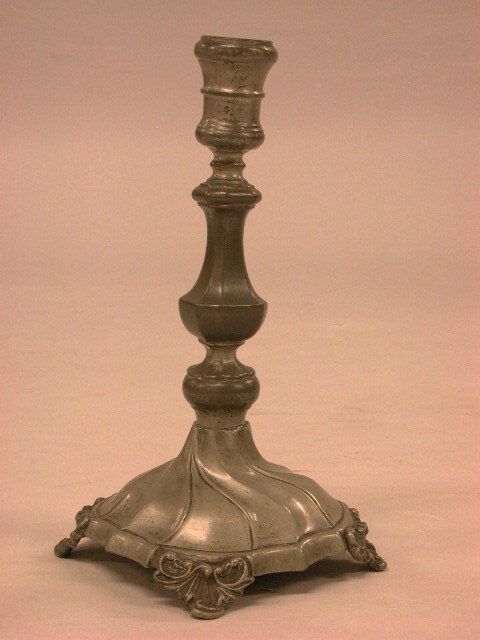 - BeschrijvingHollandse kandelaar.Overgang van Lodewijk XIV naar Lodewijk XV- régence stijl. De voet wijd klokvormig en op vier pootjes.De steel is geprofileerd en in Lodewijk XIV-stijl.De kaarsenhouder is iets uitlopend maar buigt bij de rand weer naar binnen.