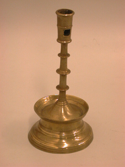 - BeschrijvingHoge voet met holronde wand, afgesloten door brede vetvanger met schuine rand. Uit de vetvanger oprijzende kegelvorm, overgaand in steel met 3 platte knopen, waarvan de middelste iets groter is dan de andere. Een houder met zijgaten en rond onder-, midden- en bovenprofiel.