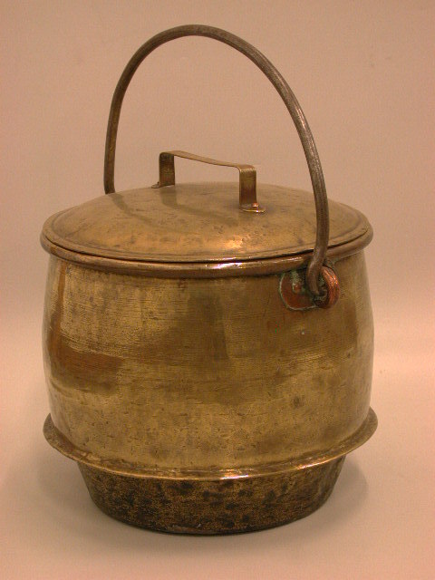 - BeschrijvingGeelkoperen ketel met zak, flauw bollende wand en twee roodkoperen oren met ijzeren hengsel. Geelkoperen gewelfde deksel met dito plat handvat.