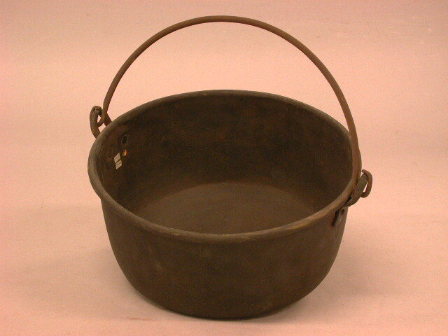 Geelkoperen pan/ketel met vlakke bodem, rechte wand, ronde rand, 2 roodkoperen oren en ijzeren hengsel.