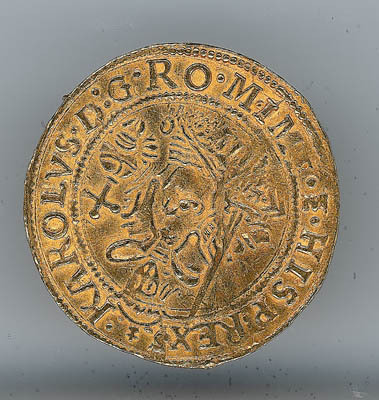 Voorzijde: binnen een parelrand de in harnas geklede, gekroonde keizer ten halven lijve met zwaard en rijksappel; omschrift: +KAROLVS¬‡D‡G‡ROM‡IMPE‡Z‡HISPA‡REX, handje