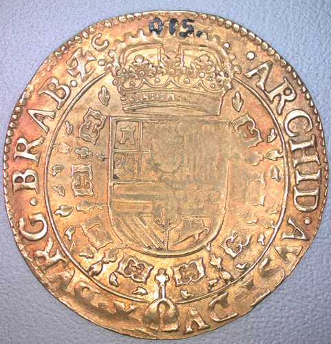 Keerzijde: grootendeels binnen een getrokken rand het gekroonde wapen van Philips IV omhangen met een Gulden Vliesketen, welke beide gedeeltelijk door de getrokken rand heensteken. Omschrift buiten de getrokken rand.