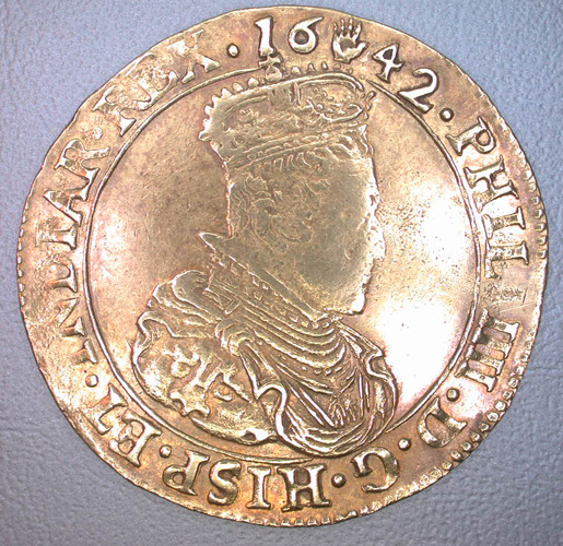 Voorzijde: binnen een getrokken rand een naar rechts gewende gekroonde buste van koning Philips IV. Omschrift buiten de getrokken rand.