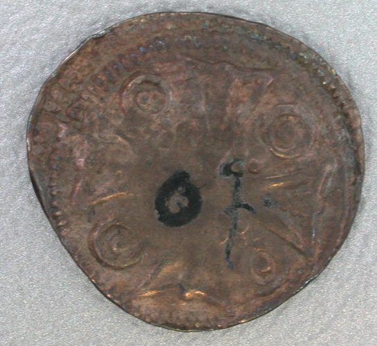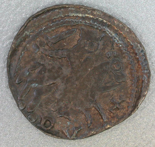 - BeschrijvingVoorzijde: Geharnaste ridder te paard, naar rechts rijdend. Onder het paard een opschrift. Om het geheel een dubbele parelrand. Keerzijde: Brabants kruis met vier kruisvormig stippen en vier ringen met een stip erin tussen de armen. Om het geheel een dubbele parelrand. De dubbele rand is aan de onderzijde afgesneden.