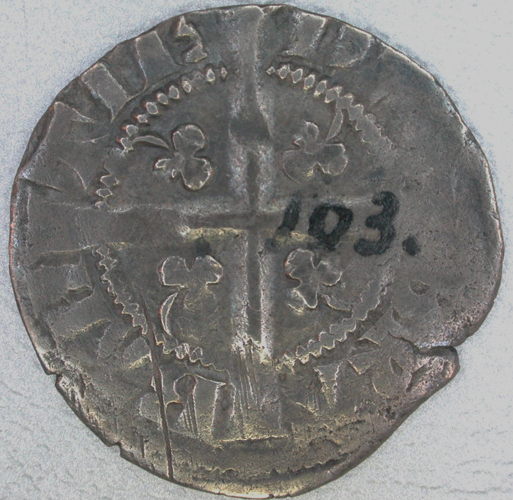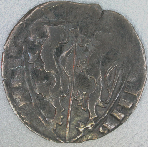 - BeschrijvingVz: Gedeeld schild met de Brabantse en Limburgse leeuw. Daaromheen het omschrift. Kz: Gevoet kruis in de kwartieren driebladige bloemen die met de omrignende parelrand verbonden zijn. Daaromheen het omschrift.
