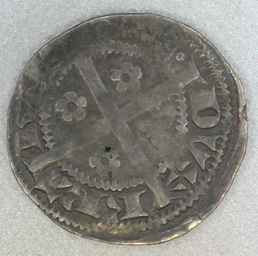 - BeschrijvingVz: Een linksgewende mannenkop binnen een parelrand. Daaromheen het omschrift en een tweede parelrand. Kz: Binnen een parelrand een gevoet kruis in de kwartieren drie rozetten, en één driebladige bloem. Het kruis doorsnijdt het omschrift daaromheen een tweede parelrand.