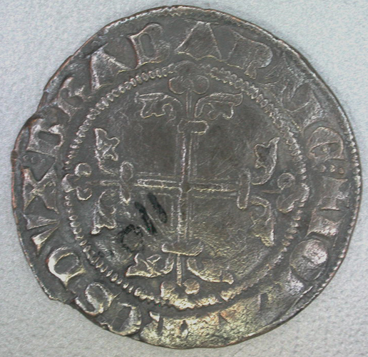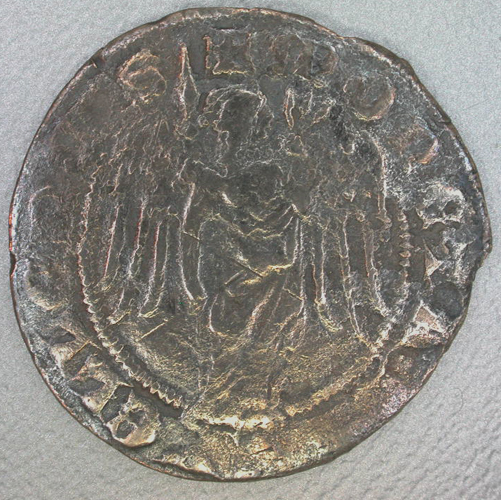 - BeschrijvingVz: Staande aartsengel Michael met een lans in de linker- en drie nagels van het kruis in de rechterhand. Tussen twee parelranden het omschrift. Kz: Een gebloemd kruis. Tussen twee parelranden het omschrift.