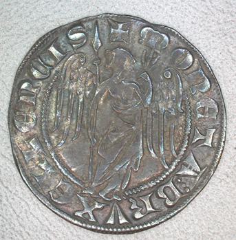 - BeschrijvingVz: Staande aartsengel Michael met een lans in de linker- en drie nagels van het kruis in de rechterhand. Tussen twee parelranden het omschrift. Kz: Een gebloemd kruis. Tussen twee parelranden het omschrift.