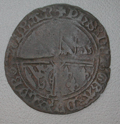 - BeschrijvingVz: Het gehele veld beslaande hertogelijke wapen. Tussen twee parelranden het omschrift. Kz: Lang gevoet kruis, dat het tussen twee parelranden gevatte omschrift doorsnijdt.
