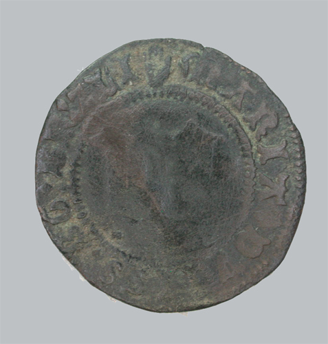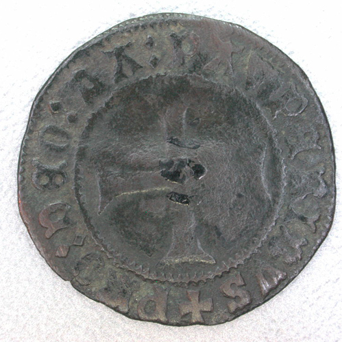 - BeschrijvingVz: Een M in gotische kapitaal. Tussen twee parelranden het omschrift. Kz: Een gevoet kruis. Tussen twee parelranden het omschrift.