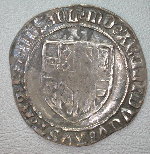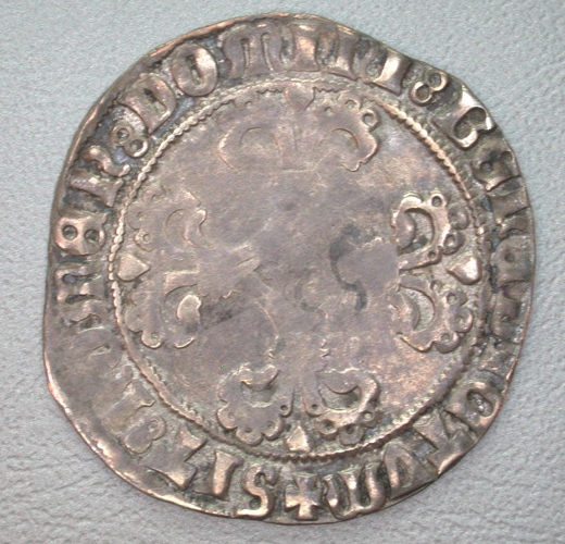 - BeschrijvingVz: Het wapen van Philips de Schone. Tussen twee parelranden het omschrift. Tussen twee parelranden het omschrift. Kz: Een gebloemd kruis met een leeuwtje in het hart. Tussen twee parelranden het omschrift.