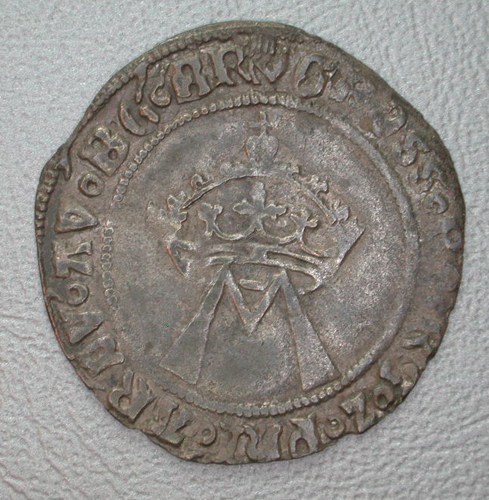 - BeschrijvingVz: Een gekroonde M. Tussen twee parelranden het omschrift. Kz: Een gebloemd kruis, beladen met het wapen van Oostenrijk-Bourgondiƫ. Tussen twee parelranden het omschrift.