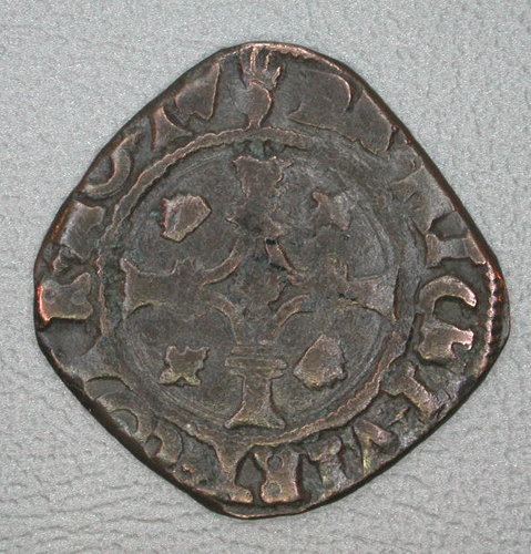 Kz: binnen een parelrand een gevoet kruis met een leeuwtje in het hart, in de kwartie¬ren twee leeuwtjes en twee fleurs-de-lis (op beide munten wisselend in volgorde); omschrift: DA+MICHI+VIRT+COTR+HO+TV, handje
