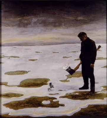 Man met bijl bij kerstboompje.