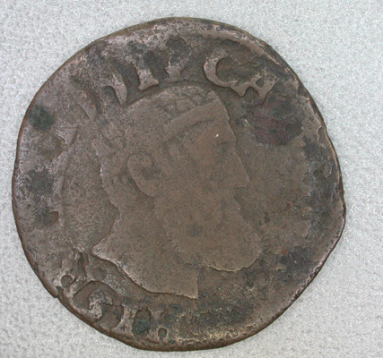 - BeschrijvingVz: Een gekroonde hoofd van Karel V naar rechts. Tussen een getrokken rand en een kabelrand het omschrift. Kz: Een klimmende leeuw binnen een getrokken rand, een kabelrand en een parelrand.