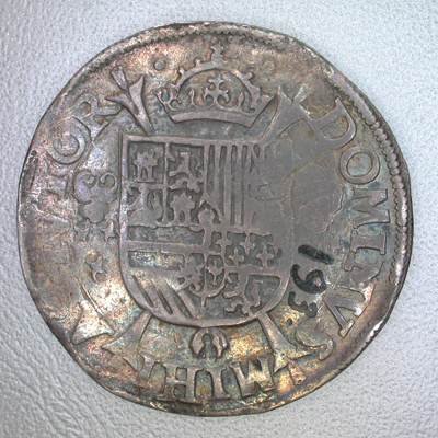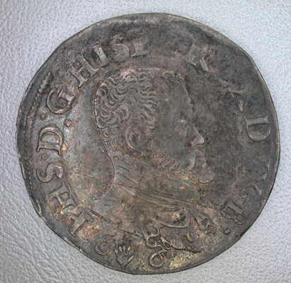 Vz:Ongekroond borstbeeld van Philips II naar rechts. Daaronder het jaartal 6 handje 6. Daaromheen het omschrift en een parelrand. Kz: Een stammenkruis, beladen met het gekroonde Spaans-Oostenrijks-Bourgondische wapen, waaronder het ordeteken van het Gulden Vlies hangt. Ter weerszijden van het wapen een vuurstaal met vonken. Tussen een dubbele getrokken rand en een parelrand het omschrift.