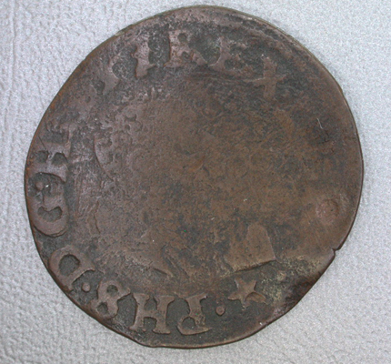 - BeschrijvingVz:Ongekroond borstbeeld van Philips II naar rechts. Daaromheen het omschrift en een parelrand. Kz: Gevoet kruis beladen met het gekroonde Oostenrijks-Bourgondische wapen. Daaromheen het omschrift en een parelrand.